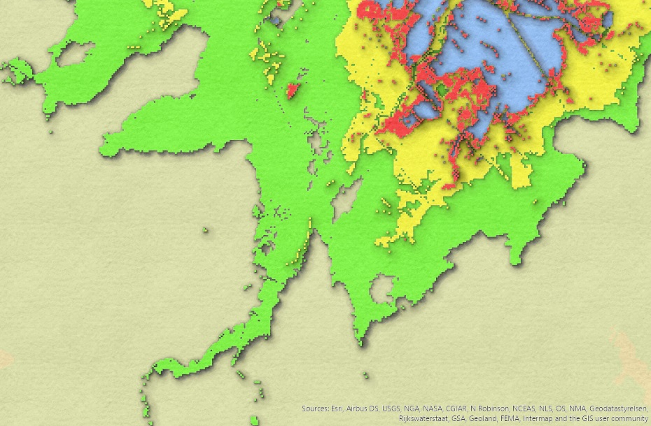 Enter @john_m_nelson's treasure trove of ArcGIS Pro map styles, augmented by not a few YouTube videos on those and beyond. Papercut works well for topography, but following his advice "not to use tools as originally intended" - a must-see is his masterclass in Geospatial Frontiers - I wondered if it could illustrate the sea creeping over land? Tan (above sea level) and blue (below sea level) are the topography, red/yellow/green are 0.5, 2 and 6 m. sea level rise models explained here with geographic context. Coastal inundation from NE to SW uncovers new estuaries and promontories.