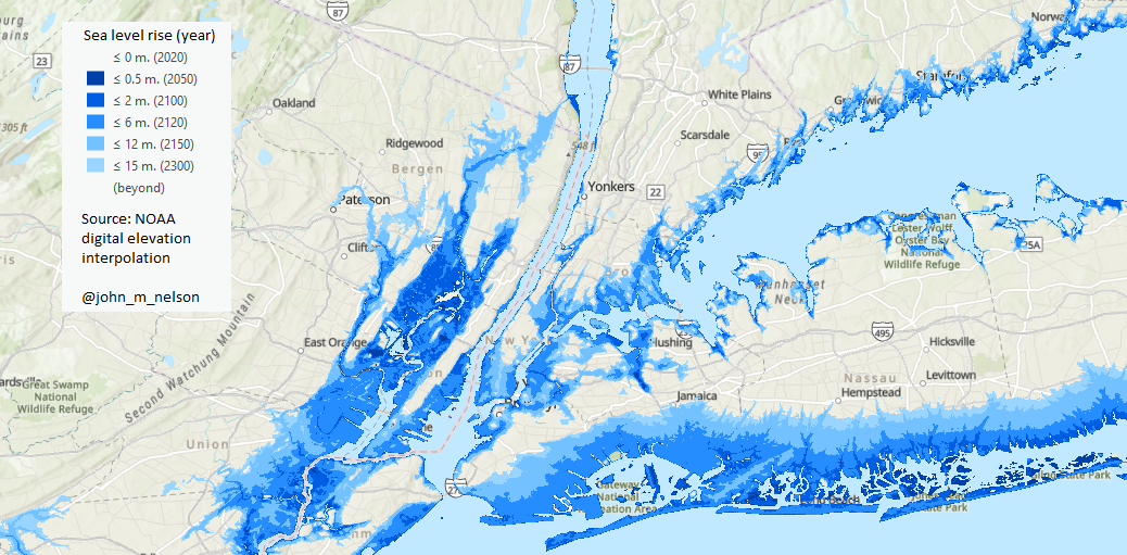 Discussing since then with Esri's John Nelson brought to my attention the same dataset online, which I then styled the same way. I was able to use this in discussing the sea level rise situation in New York as well as the current hurricane situation, by sharing these images to those non-technical, in both planar and globe view. This is what I showed from my desktop GIS: